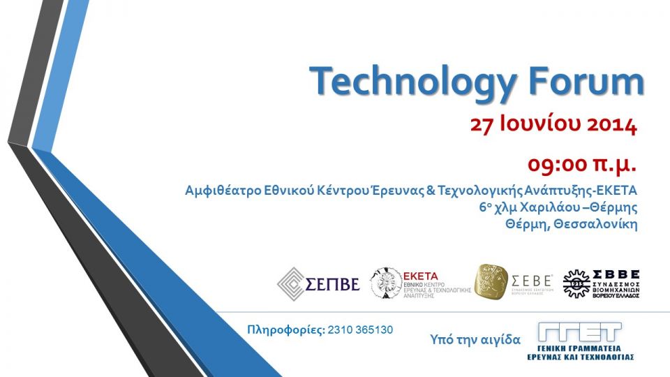 Στις 27/06/2014, οι ΣΕΠΒΕ, ΕΚΕΤΑ, ΣΕΒΕ, ΣΒΒΕ με την ενεργό συμμετοχή του ΠΑΜΑΚ και του ΑΠΘ οργανώνουν το Technology Forum υπό την αιγίδα της ΓΓΕΤ στον χώρο του ΕΚΕΤΑ, ώρες 9:00-18:00.