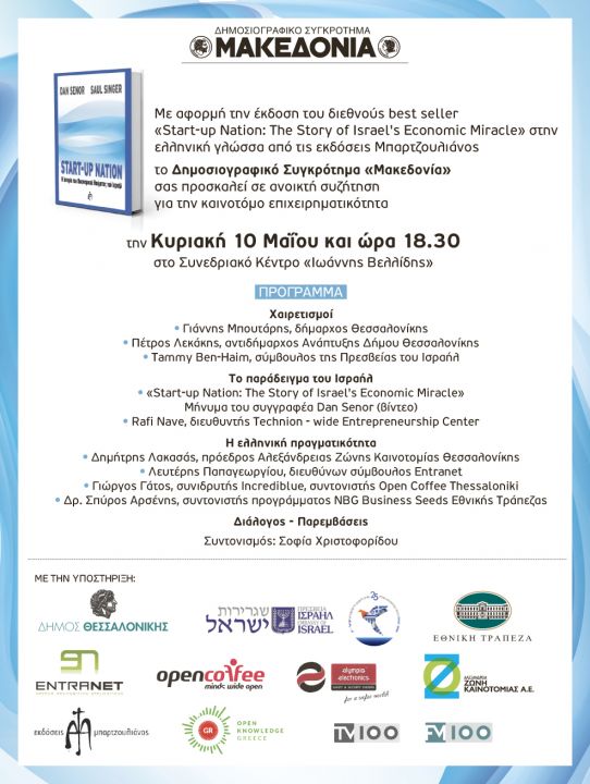 Με αφορμή την έκδοση του βιβλίου ''Start up nation: Τhe Story of Israel's Economic Miracle'' η εφημερίδα ''ΜΑΚΕΔΟΝΙΑ'' διοργανώνει την Κυριακή 10 Μαϊου 2015 στο Συνεδριακό Κέντρο ''Ιωάννης Βελλίδης'' και ώρα εκδήλωση για την καινοτόμο επιχειρηματικότητα.