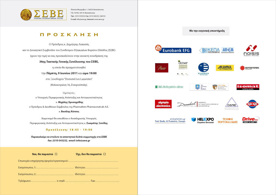 36η Γενική Συνέλευση του Συνδέσμου Εξαγωγέων Βορείου Ελλάδος την Πέμπτη 9 Ιουνίου 2011 και ώρα 19.00 στο Ξενοδοχείο “Domotel Les Lazaristes” (Κολοκοτρώνη 16, Σταυρούπολη) με ομιλητή τον Υπουργό Περιφερειακής Ανάπτυξης και Ανταγωνιστικότητας κ. Μιχάλη Χρυσο 08/06/2011