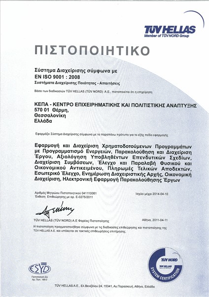 Με επτυχία ολοκληρώθηκαν οι διαδικασίες για την ανανέωση έως τις 10/4/2014 του πιστοποιητικού ποιότητας του ΚΕΠΑ και κατ' επέκταση της ΚΕΠΑ-ΑΝΕΜ στην οποία το ΚΕΠΑ έχει την επιχειρησιακή ευθύνη διαχείρισης των προγραμμάτων της, σύμφωνα με το πρότυπο ISO 9001: 2008. Με σταθερή προσήλωση στις αρχές της διαφάνειας, της απολεσματικότητας, της αξιοποιστίας και της παροχής υψηλής ποιότητας υπηρεσιών προς τις επιχειρήσεις της χώρας το ΚΕΠΑ και η ΚΕΠΑ-ΑΝΕΜ με την τεράστια εμπειρία και τεχνογνωσία που διαθέτουν στη διαχείριση Εθνικών και Ευρωπαϊκών Προγραμμάτων, συνεχίζουν την εικοσαετή επιτυχή πορεία τους για τη στήριξη της επιχειρηματικότητας και την περιφερειακή ανάπτυξη.