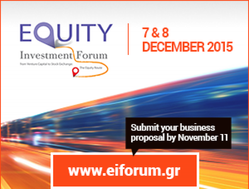 Μέχρι τις 11 Νοεμβρίου παρατείνεται η υποβολή των επιχειρηματικών προτάσεων στο πλαίσιο του Equity Investment Forum, που θα διεξαχθεί στην Αθήνα στις 7 & 8 Δεκεμβρίου 2015 το οποίο αποτελεί συνέργεια του Χρηματιστηρίου Αθηνών, του Οργανισμού Enterprise Greece, της Ένωσης Ελληνικών Εταιρειών Επιχειρηματικών Κεφαλαίων (HVCA), του Ταμείου Ανάπτυξης Νέας Οικονομίας (ΤΑΝΕΟ Α.Ε.) και του Δικτύου ΠΡΑΞΗ, συντονιστή του Enterprise Europe Network – Hellas.