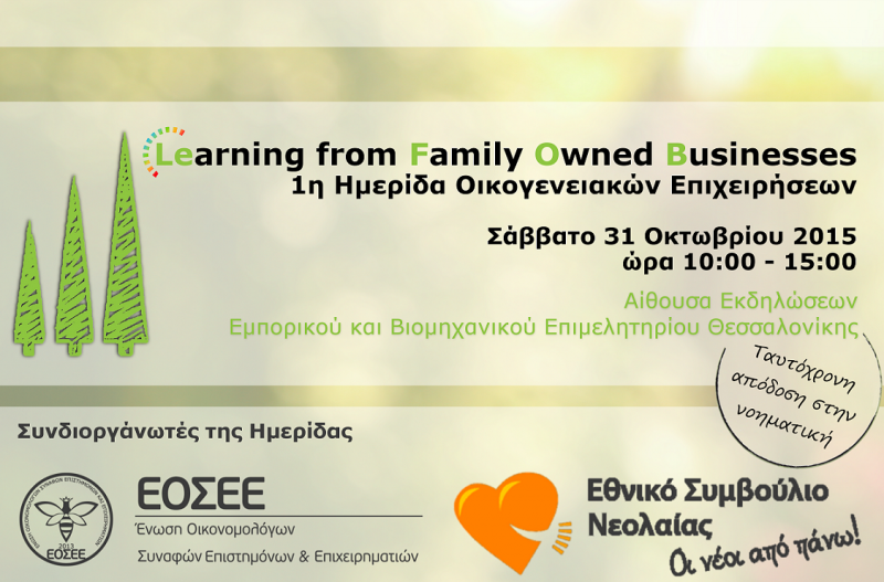Η Ένωση Οικονομολόγων Συναφών Επιστημόνων & Επιχειρηματιών - ΕΟΣΕΕ σε συνεργασία με το Εθνικό Συμβούλιο Νεολαίας – ΕΣΥΝ διοργανώνουν το Σάββατο 31 Οκτωβρίου 2015, από τις 10:00 πμ – 15:00 μμ στην Αίθουσα εκδηλώσεων του Εμπορικού και Βιομηχανικού Επιμελητηρίου Θεσσαλονίκης (ΕΒΕΘ), Τσιμική 29, στη Θεσσαλονίκη, Εκδήλωση – Ημερίδα με θέμα την Οικογενειακή Επιχειρηματικότητα «Learning from Family Owned Businesses».